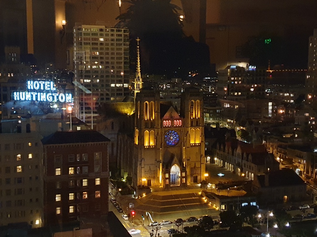하루의 마무리는 인터콘티넨탈 마크 홉킨스(InterContinental Mark Hopkins) 호텔이었어요. 이곳 라운지 바는 사실 야경 명소로도 유명하죠. 자리에 앉아 창밖을 내다보는데, 낮에 다녀왔던 그레이스 대성당이 조명을 받아 은은하게 빛나고 있더라고요. 🏛️✨ 어둠 속에서 성스럽게 존재감을 드러내는 성당의 실루엣은 마치 정교하게 그려진 유화 한 폭 같았어요. 칵테일 한 잔을 기울이며 그 풍경을 감상하니 샌프란시스코의 밤이 더없이 로맨틱하게 정리되는 기분이었죠. "이 맛에 여행하지!"라는 감탄사가 절로 나오는 순간이었답니다.